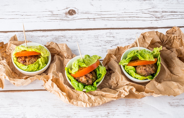 - Place burgers on top of lettuce. Then top burgers with remaining apple, onions and Brie. Wrap lettuce around burger like a bun. Yum.
