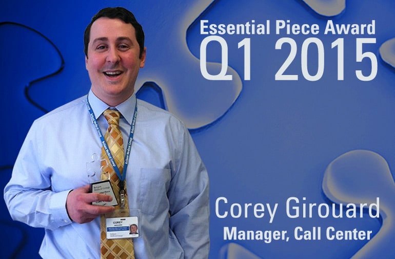 Each quarter, one employee is chosen to receive our “Essential Piece Award.” For Q1 of 2015, our winner is Corey Girouard, Manager, Call Center! Congratulations, Corey, and thank you for …